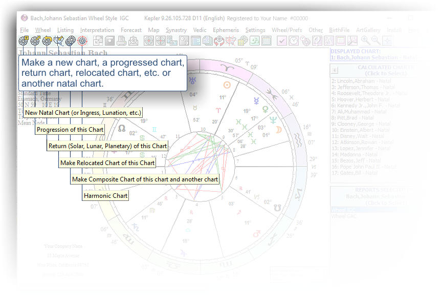 Kepler is an extraordinarily powerful program with and endless number of features. We have carefully crafted every part of the user interface to enable you to get the information you want in a smooth and intuitive manner. Many programs allow you to do the basics of pulling up a chart with ease. But suppose you want to do something creative like look at the midpoint structures formed between a solar return and a natal chart or a harmonic chart of a composite chart. Even if your approach to astrology is simple or you are a beginner, when the day comes when you want to explore a new idea or step outside the basics, you will be glad that you have Kepler. It all starts with the color-coded icons at the top of the main window. Click on the thumbnails for full screen shotBlue Icons: Make a new chart. A progression, solar return, composite chart, relocated chart, and harmonic chart, for example, give you a new set of planetary positions. Make new charts with the blue icons. Green Icons: Select chart wheels, interpretations, listings. Here you select whatever information you want about this chart, whether it is a wheel, interpretation, table, listing, etc.