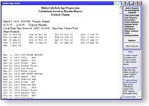 The second image shown on the right includes planet positions and the third one is in a table format. These are just a few examples of the kinds of transit-to-transit, transit-to-natal, progressed-to-natal, and progressed-to-progressed listings that are available. The reason why there is so much flexibility allowed in the transit and progressed text listings is because Sirius users have requested these features. Some astrologers and researchers in astrology prefer information to be provided in a particular way and we strive to provide as much flexibility as possible to meet the needs of different people.