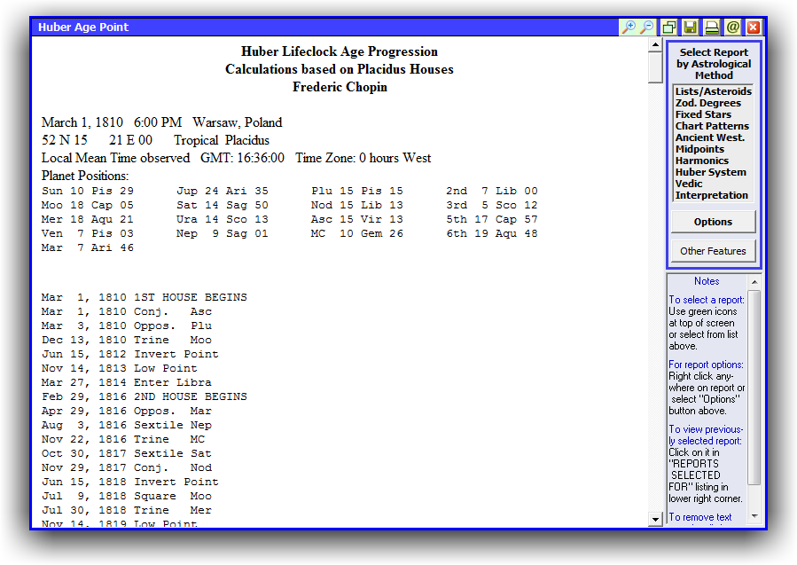 The Huber Age Point and Logarithmic Time Arcs are two examples of forecasting methods developed by modern astrologers. The Huber system was developed by Bruno and Louise Huber and Huber patterns, Huber wheels, and other details of the Huber system are available in Sirius. One part of the Huber system is the Age Point system of predicting. There is a fairly large number of followers of the Huber system and also astrologers who use some parts of the Huber system.