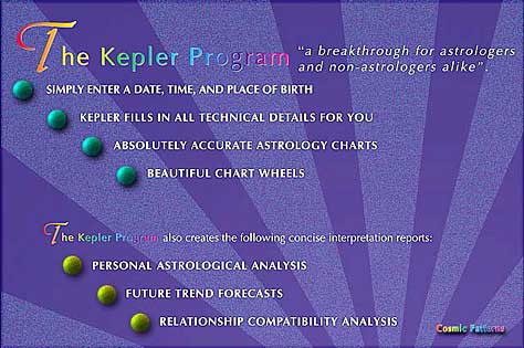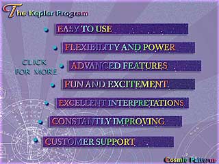 A complete self-guided learning system, comprehensive reference materials, 450 beautiful graphic images, over 7,000 birth data of famous people and businesses, superb research capabilities, and the "Live Mini Reading", a personal astrological analysis that is heard on the computer speakers with background music and accompanying pictures make the Kepler program exciting and useful for the entire family. |